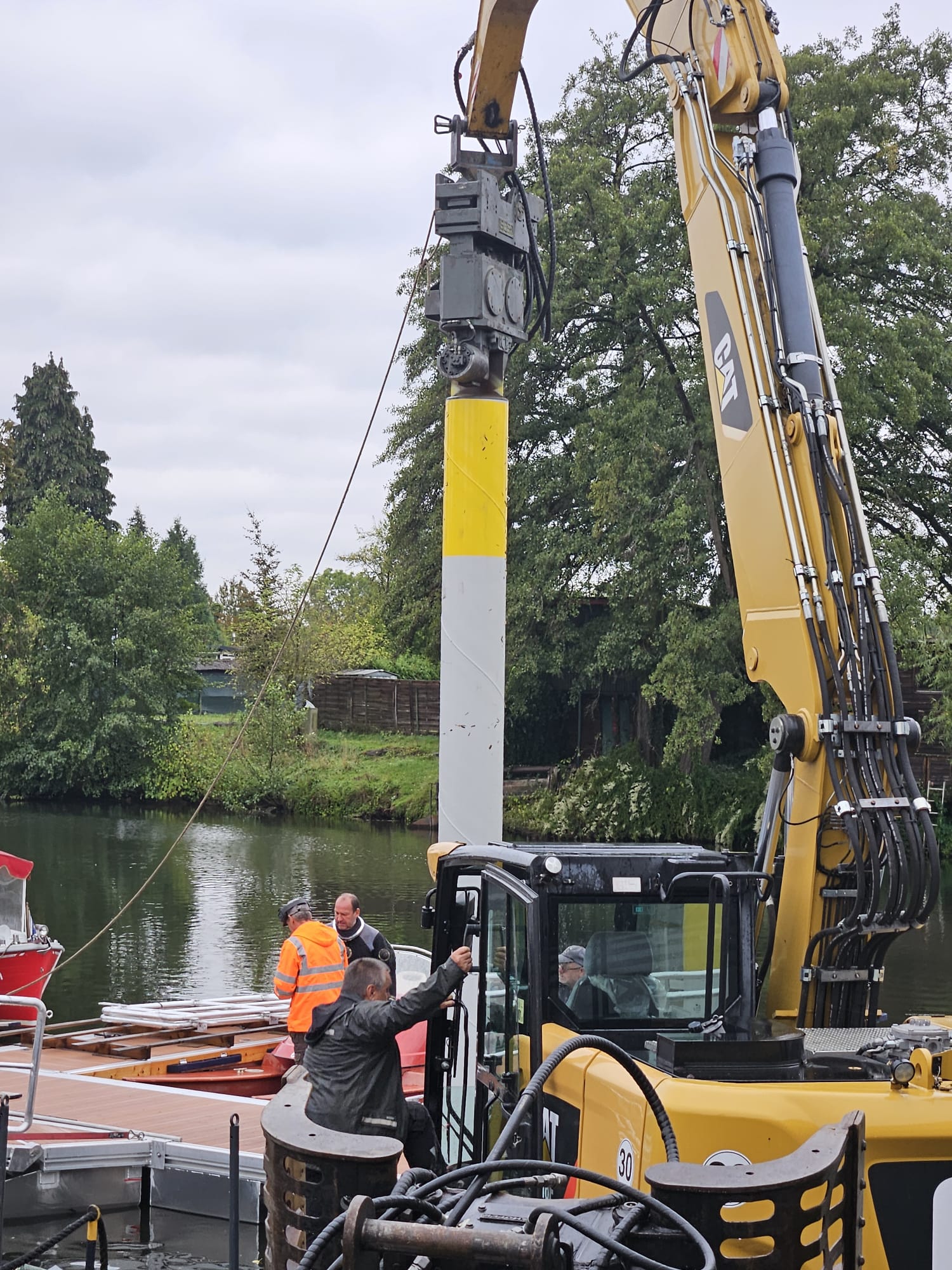 Nachdem die Genehmigungen vorlagen rückte die Firma Fred Babbel aus Mecklenburg-Vorpommern mit Tieflader, Bagger und Ramme an um den Steg zu Wasser zu bringen.