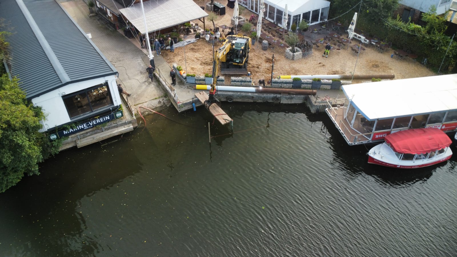 Nachdem die Genehmigungen vorlagen rückte die Firma Fred Babbel aus Mecklenburg-Vorpommern mit Tieflader, Bagger und Ramme an um den Steg zu Wasser zu bringen.